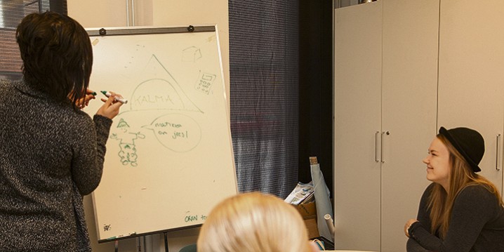 Sara Laitinen piirsi Kalman kolmiologon. Noora Korhonen (oik.) ja Lissu Ylinen kehuvat pienen ainejärjestön ilmapiiriä. Kalmassa omista pidetään huolta.