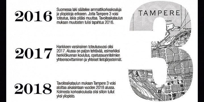 Huhtikuussa Tampere 3:n ohjausryhmä kokosi linjauksistaan yhteenvedon, ja selvitystyön loppuraportin pitäisi ilmestyä toukokuun puolivälissä. Ylioppilaskunta Tamy järjestää asiaa käsittelevän ylioppilaskunnan kokouksen 21. toukokuuta.