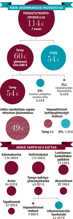 Ylioppilaskunta31.10.2015 Näin jäsenmaksusi muodostuu Tweet Emmi Venäläinen, teksti Emmi Venäläinen, teksti & Samuli Huttunen, grafiikka Tämä kaavio selventää, mihin kaikkeen jäsenmaksusi käytetään Kirjoittaja on Tamyn hallituksen jäsen.