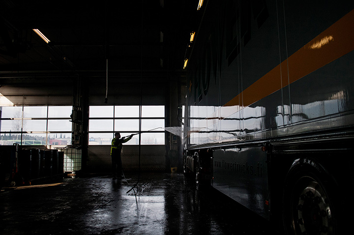 Matka alkaa Flowertrucksin Sarankulman terminaalilta. Kuski Marko Pussinen pesee auton itse painepesurilla.